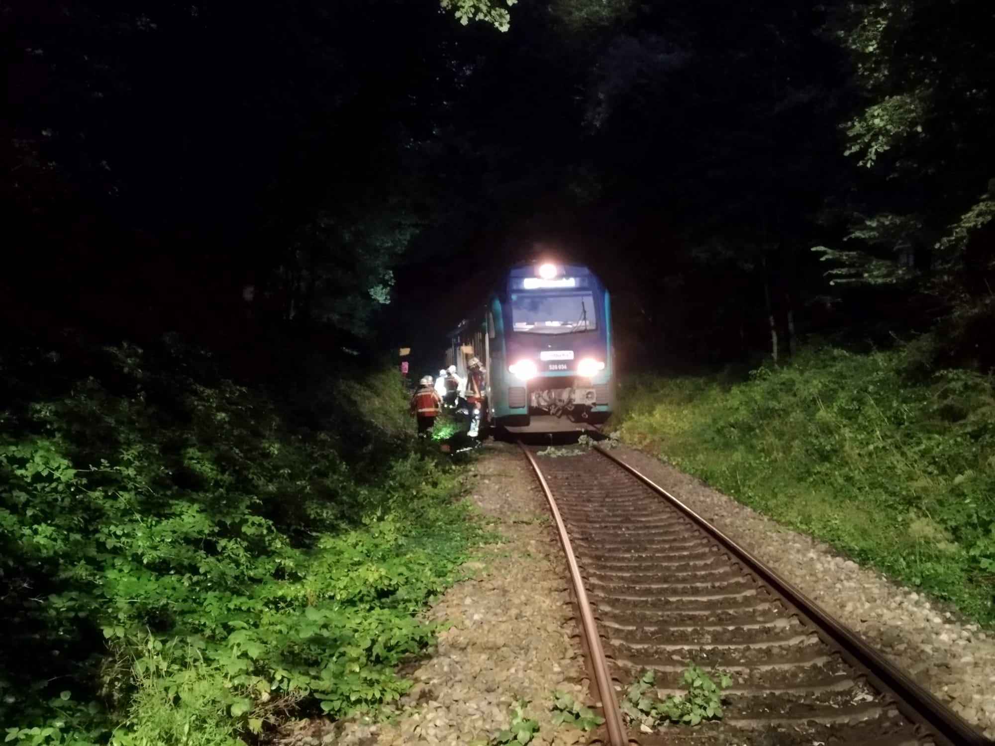 Am Einsatzort eingetroffen, fanden wir einen Zug vor, der mit einem Baum kollidiert war. Dabei wurde der Zug leicht beschädigt. Die 12 Fahrgäste sowie der Fahrer blieben unverletzt.