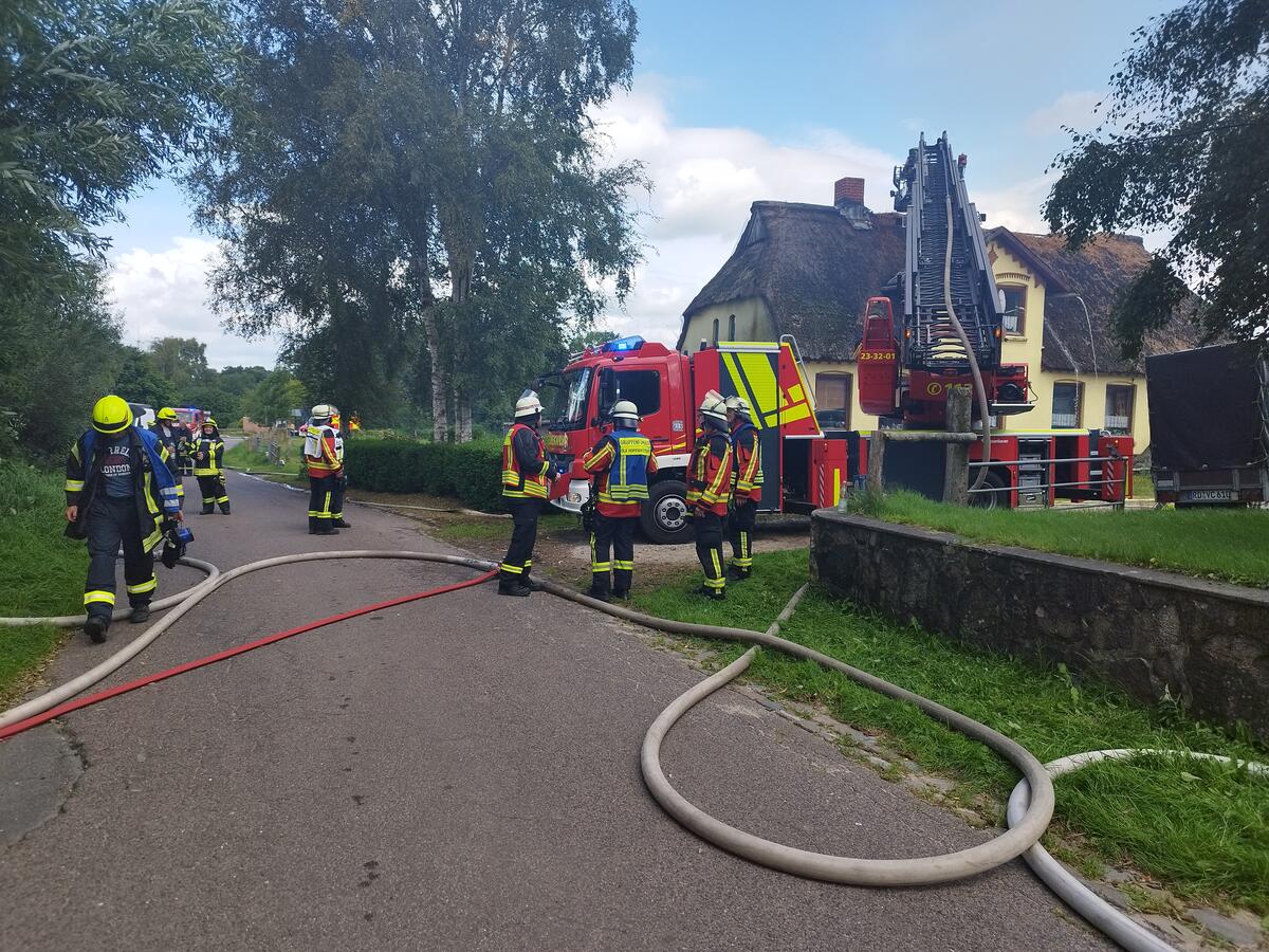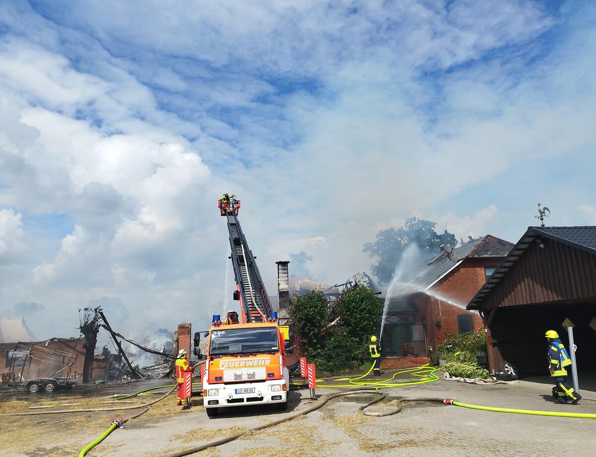 Diesmal ging es zur Unterstützung unserer Kameradinnen und Kameraden nach Steenfeld. Das ausgedehnte Feuer auf einem landwirtschaftlichen Anwesen hatte sich neben mehreren Stall- und Werkstattgebäuden auf ein benachbartes Reetdachhaus ausgebreitet. Durch den zügigen Einsatz unserer Drehleiter konnte das reetgedeckte Gebäude gerettet werden. U.a. der Einsatz einer zweiten Drehleiter aus Itzehoe und mehrerer handgeführter Strahlrohre ist es zu Verdanken, dass auch das Wohngebäude des landwirtschaftlichen Anwesen gerettet werden konnte.