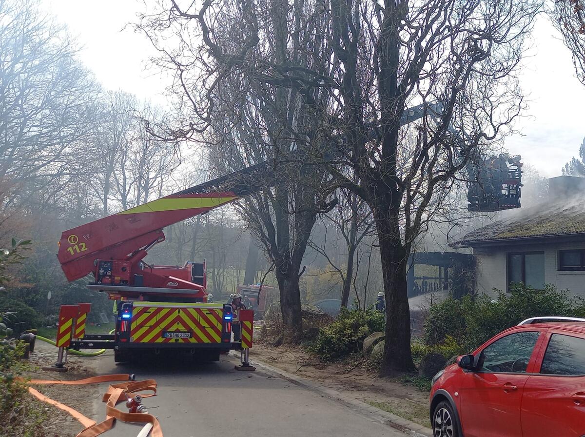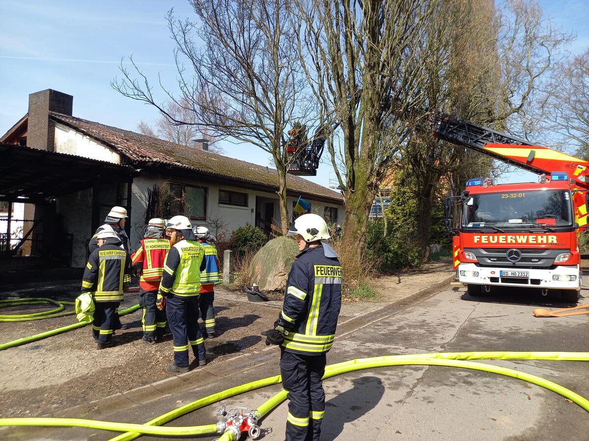 Gemeinsam mit unseren Kameradinnen und Kameraden aller Aukruger Ortswehren sind wir mit unserer Drehleiter zur Unterstützung bei einem Feuer in einem Mehrparteienhaus alarmiert worden. Ursprünglich als Kellerbrand gemeldet, breite sich das Feuer auf einen hölzernen Anbau und im Verlauf auch auf den Dachstuhl aus. Somit wurde das Stichwort auf FEU G (Feuer größer Standard) erhöht. Im Einsatz waren mehrere Trupps unter schwerem Atemschutz im Innenangriff sowie mehrere handgeführte Strahlrohre anfangs auch im Außenangriff. Dank das zielgerichteten und umsichtigen Einsatzes aller eingesetzten Einsatzkräfte konnte ein Totalverlust des Objektes verhindert werden. Verletzt wurde glücklicherweise niemand. Das Haus ist derzeit unbewohnbar.