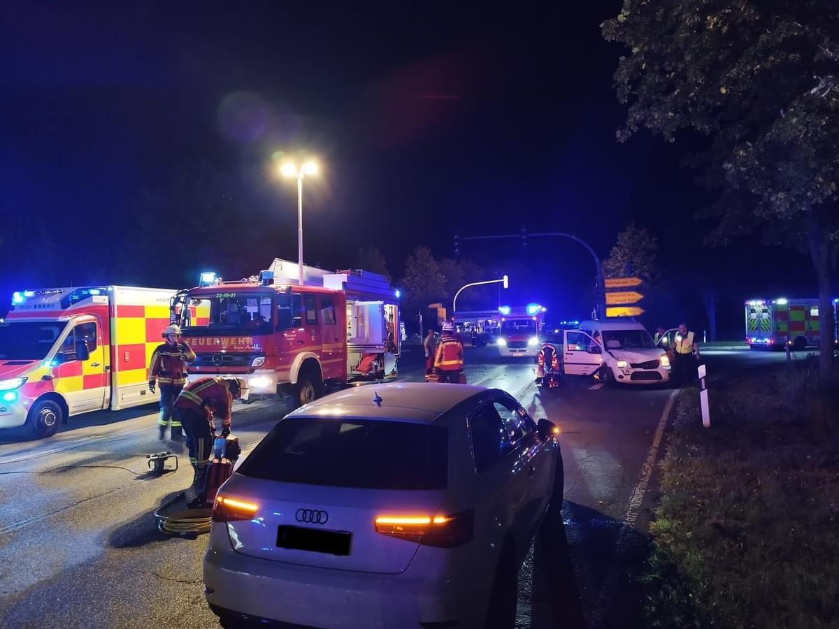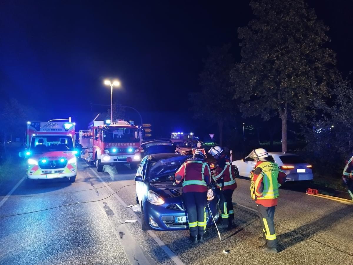 Zwei mit jeweils zwei Personen besetzte PKW waren im Kreuzungsbereich der Bundesstraße 430 zusammengestoßen. Da bei unserem Eintreffen noch kein Rettungsdienst vor Ort war konzentrierten wir uns zunächst auf die Sichtung und Erstversorgung der Patienten. Im weiteren Verlauf musste eine Person mittels hydraulischem Rettungsgerät aus ihrem Unfallfahrzeug befreit werden. Mit uns im Einsatz waren die @rkish.de mit vier RTW und OrGL, die @feuerwehrnms mit einem NEF und der Rettungshubschrauber Christoph 42, sowie die Polizei.