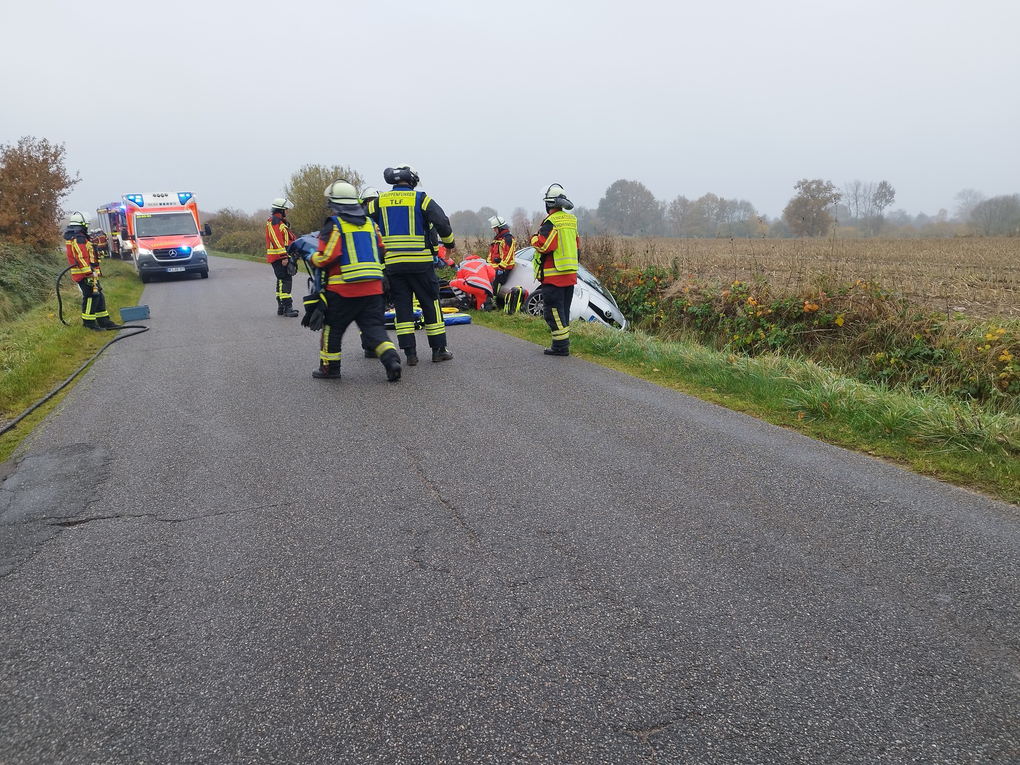 Parallel zu dem vorangegangenen Einsatz kam es zu einem Verkehrsunfall mit zwei verletzten Personen, die noch in einem Fahrzeug eingeschlossen sein sollten.Da wir Kräfte bei dem vorangegangenen Einsatz frei hatten, konnten wir schnell vor Ort sein. Wir stellten die notfallmedizinische Erstversorgung bis zum Eintreffen des Rettungsdienstes sicher und sicherten die Einsatzstelle ab. Nach insgesamt etwas mehr als einer Stunde konnten wir beide Einsätze beenden.