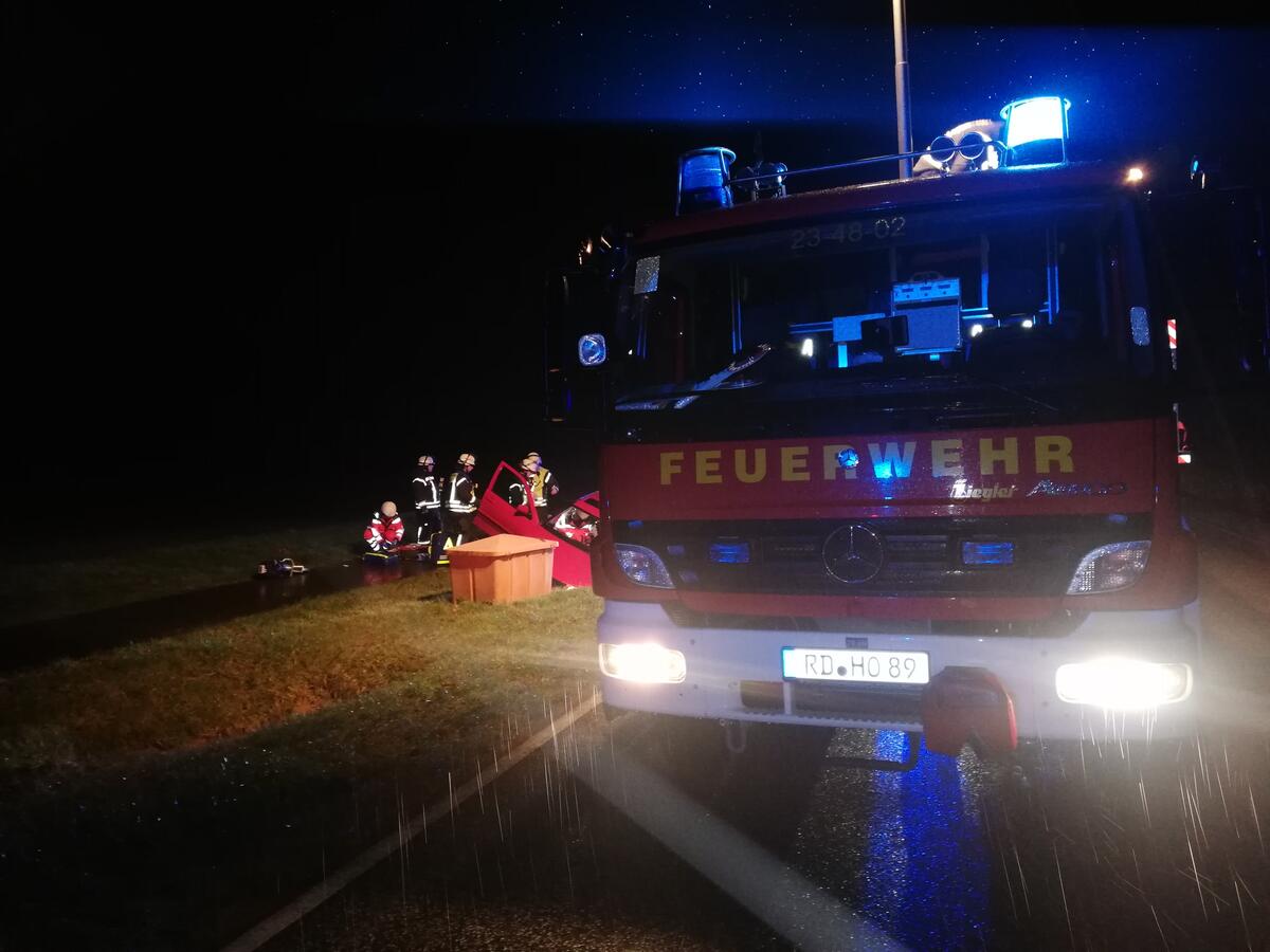 Am frühen Morgen wurden wir mit dem Stichwort "Verkehrsunfall Person eingeklemmt" alarmiert. Vor Ort stellte sich die Lage so dar, dass ein PKW fahreseitig im Straßengraben lag und der verletze Fahrer das Fahrzeug nicht selbständig verlassen konnte. Eine schonende Rettung konnte in diesem Fall auch ohne den Einsatz schwerer Geräte realisiert werden. Wir unterstützten den Rettungsdienst personell und konnten den Einsatz nach etwa 45 Minuten beenden.