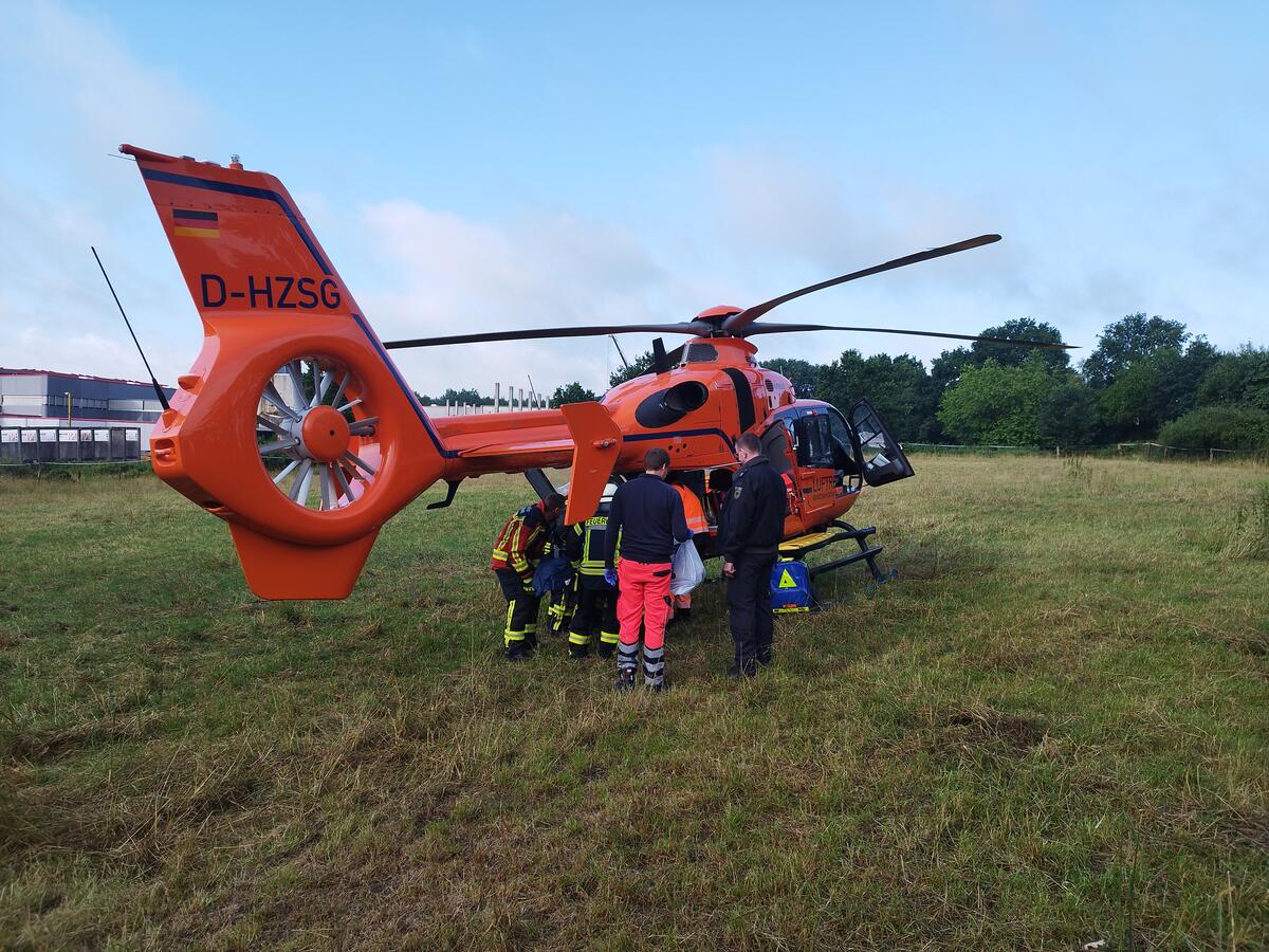 Dazu wurden sowohl die Drehleiter, eine tragbare Leiter und der Absturzsicherungs-Satz vorgenommen. Abschließend unterstützten wir noch den Rettungsdienst beim Transport zum Rettungshubschrauber.
