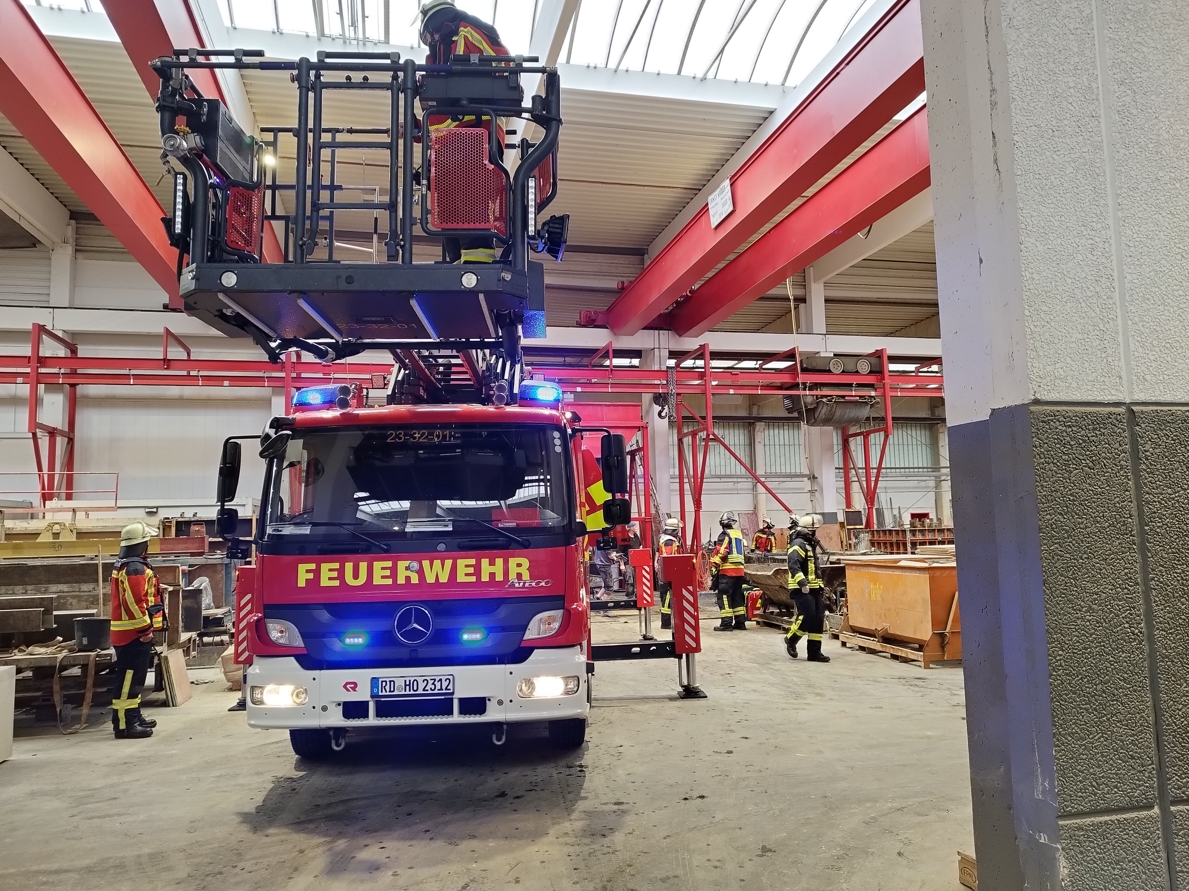 Am frühen Morgen wurden wir mit dem Stichwort "eingeklemmte Person in Maschine" alarmiert. Glücklicherweise war die Person bei unserem Eintreffen schon entklemmt, befand sich jedoch noch ungesichert in ca. 5m Höhe. Unsere Aufgabe bestand darin, die Person gegen Absturz zu sichern und per Sofortrettung zu Boden zu bringen.