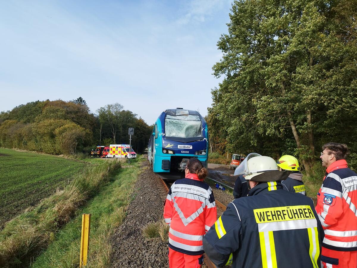 Gemeinsam mit dem Rettungsdienst wurden wir zu einem Unfall mit Beteiligung eines Zuges alarmiert. Der Zug sollte auf freier Strecke eine Kollision mit einem großen Baum gehabt haben, mit 30 Personen besetzt sein und der Triebfahrzeugführer verletzt sein. Da sich die Einsatzstelle nach kurzer Lageerkundung auf dem Gebiet der Gemeinde Wapelfeld befand, wurde die Feuerwehr Wapelfeld nachalarmiert. Der Akku -Zug der neuesten Generation wurde hierbei erheblich beschädigt. Gemeinsam mit Rettungsdienst und Feuerwehr wurde die medizinische Versorgung sowie die Betreuung der Fahrgäste sichergestellt. Des weiteren wurde der Baum aus dem Gleisbereich entfernt und die Einsatzstelle gesichert. Der havarierate Zug wurde abschließend samt Fahrgästen durch einen Ersatzzug abgeschleppt.Für uns war der Einsatz nach etwa drei Stunden beendet.Wir bedanken uns für die hervorragende Zusammenarbeit aller beteiligter Organisationen.