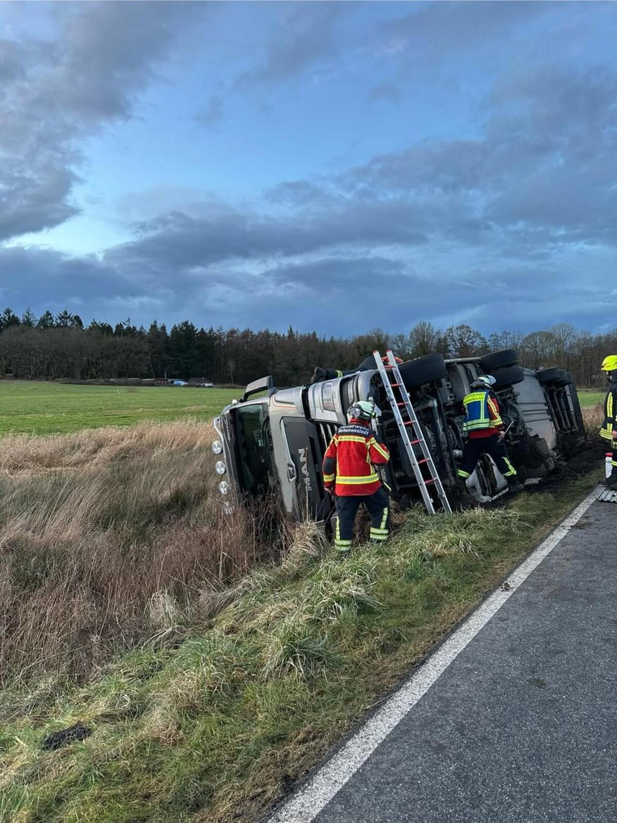 Auf der L123 kurz hinter Meezen kam es zu einem Verkehrsunfall. Ein LKW kam auf die Bankette und kippte infolge dessen auf die Seite. Bei unserem Eintreffen konnte der Fahrer sich bereits selbstständig aus dem LKW befreien. Wir kontrollierten den LKW auf auslaufende Betriebsstoffe und konnten nach ca. einer Stunde einrücken.