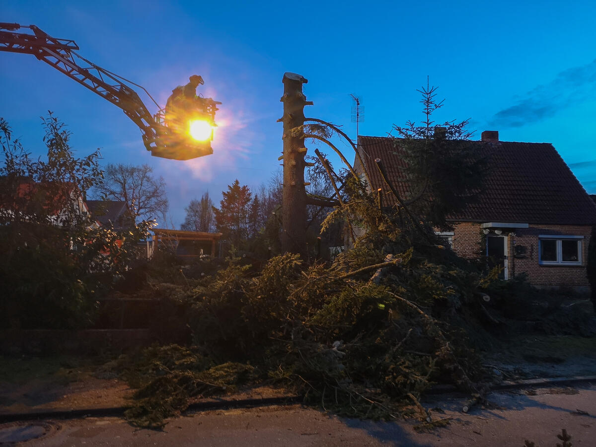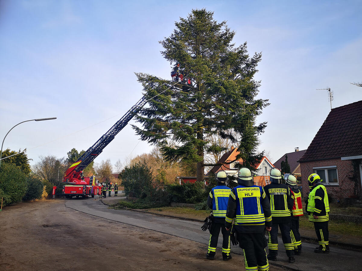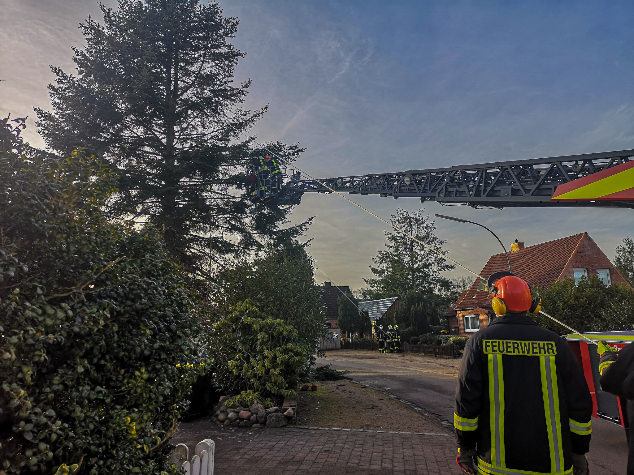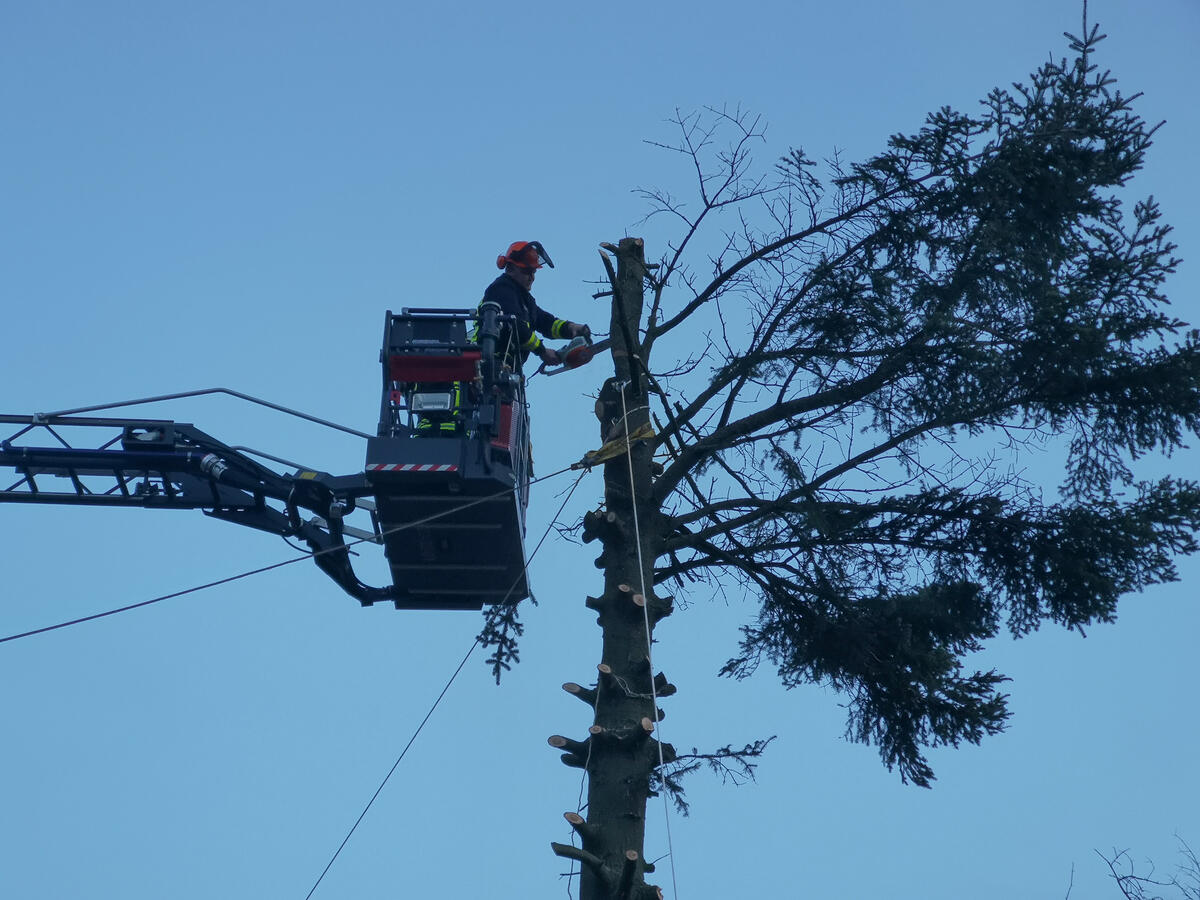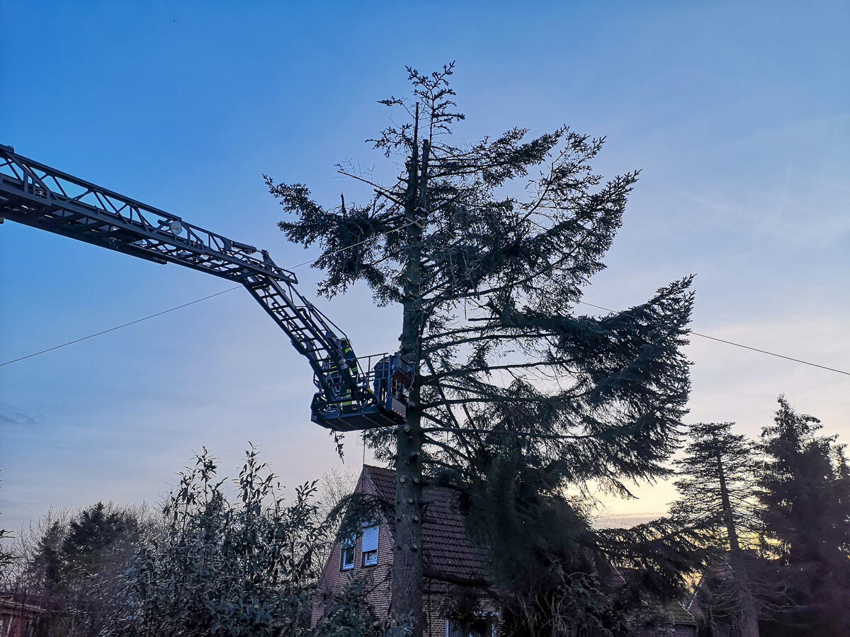 Gestern wurden wir zur Unterstützung nach Aukrug alarmiert. Durch missglückte Fällarbeiten drohte eine ca. 15 Meter hohe Tanne auf ein Einfamilienhaus zu fallen. Mit Greifzug und Radlader konnten wir den Baum sichern und anschließend aus dem Drehleiter Korb heraus nach und nach den Stamm von oben nach unten klein sägen. Nach ca. drei Stunden konnten wir wieder einrücken.