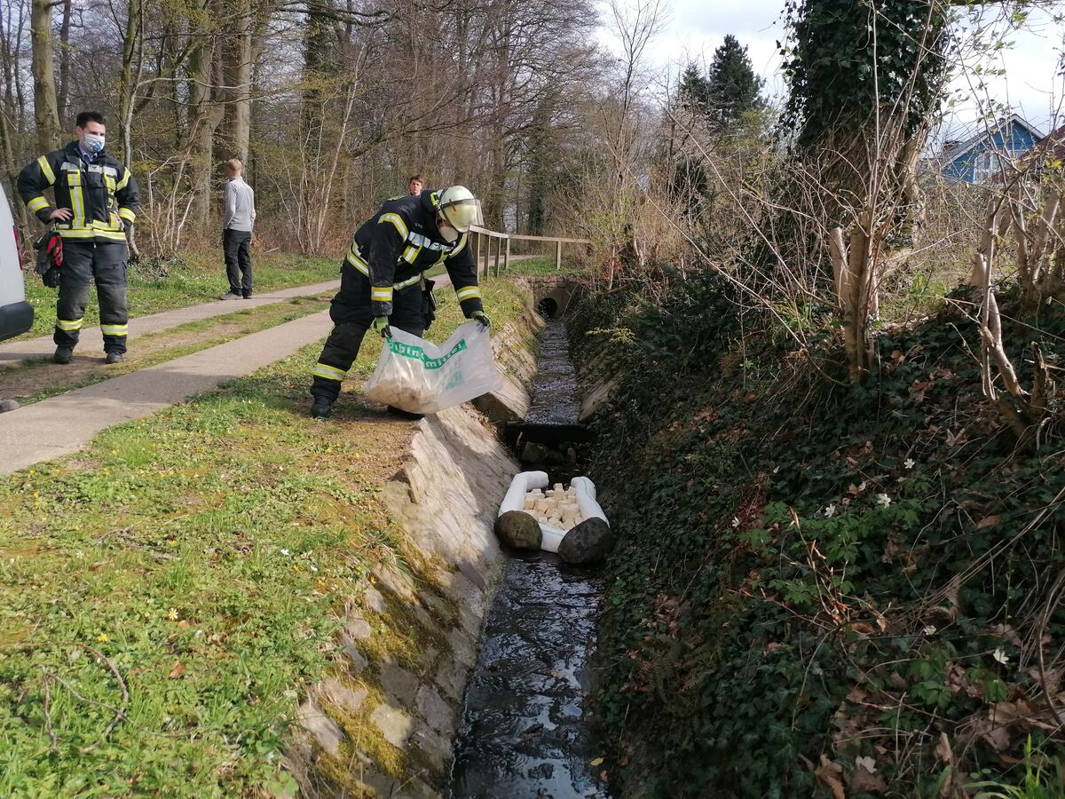 Am Nachmittag wurden wir aufgrund einer Gewässer-Verunreinigung alarmiert. Eine ölhaltige Flüssigkeit ist aus bislang ungeklärter Ursache in die Oberflächenentwässerung gelangt und drohte in nachfolgende Teichanlagen zu gelangen. Wir setzten an drei Stellen Ölsperren und brachten schwimmfähiges Bindemittel aus um weitere Verunreinigung zu verhindern. Durch die Gemeindewerke und die untere Wassebehörde wurde die Kanalisation mittels Spühl- und Saugwagen gereinigt.