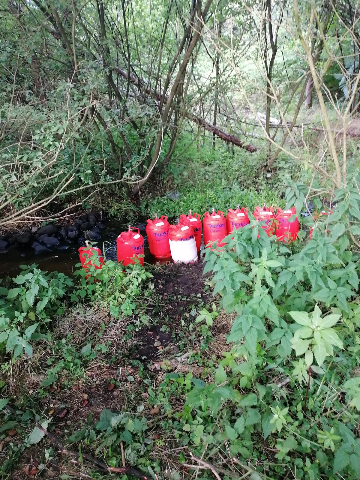 In einem Bach standen 10 Propangas-Flaschen. Alle aufgedreht und weitestgehend restentleert. Mittels Mehrgasmessgerät konnte keine Gaskonzentration festgestellt werden. Die Gasflaschen wurden geschlossen und nach Aufnahme durch die Polizei aus dem Gewässer entfernt. Wie die Gasbehälter in den abgelegen Bereich gelangt sind, war zum Ende des Einsatzes ungeklärt.
