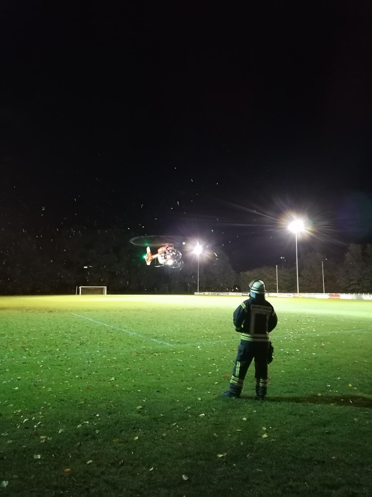 Am Abend wurden wir zur Unterstützung bei Landung des Rettungshubschraubers Christoph 42 alarmiert. Da wir uns gerade zu einer Dienstbesprechung im Gerätehaus befanden, konnten wir sehr schnell ausrücken und den Sportplatz zur Landung ausleuchten.