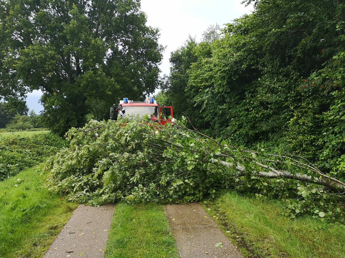 Aufgrund eines Gewitters mit Starkregen kam es am Abend zu mehreren wetterbedingten Hilfeleistungs-Einsätzen. So liefen diverse Keller voll, Straßen standen unter Wasser und Bäume fielen auf Straßen bzw. Wege sowie in einem Fall sogar auf einen PKW. Es blieb jedoch in allen Fällen glücklicherweise bei Sachschäden. Da die Vielzahl der Einsatzstellen priorisiert nacheinander abgearbeitet wurden, erhielten wir Unterstützung durch die Feuerwehr Nortorf mit ihrem Wassersauger. Gegen 23:30 waren alle Einsatzstellen abgearbeitet und alle Fahrzeuge wieder einsatzbereit.