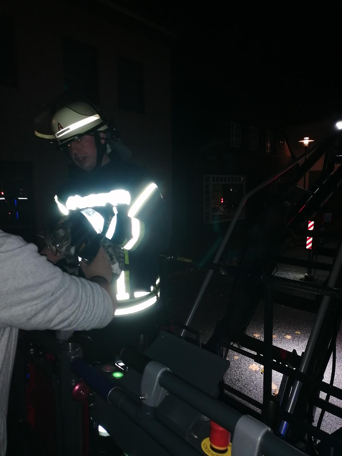 In der Nacht auf Samstag wurden wir dann alarmiert, da eine Katze an einem Fallrohr eines Gebäudes festsaß und sich nicht selbstständig befreien konnte. Hier konnten wir das Tier unter Zuhilfenahme unserer Drehleiter schnell und sicher befreien und den Eigentümern übergeben.