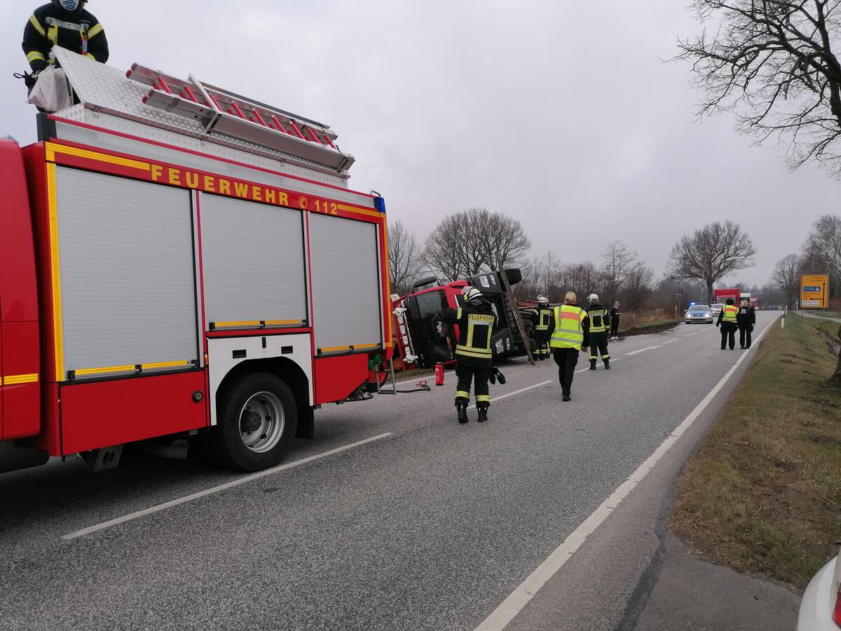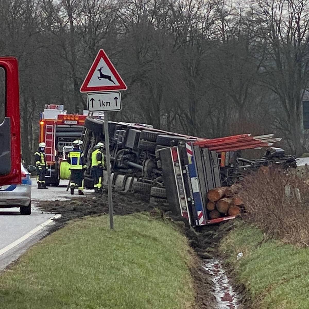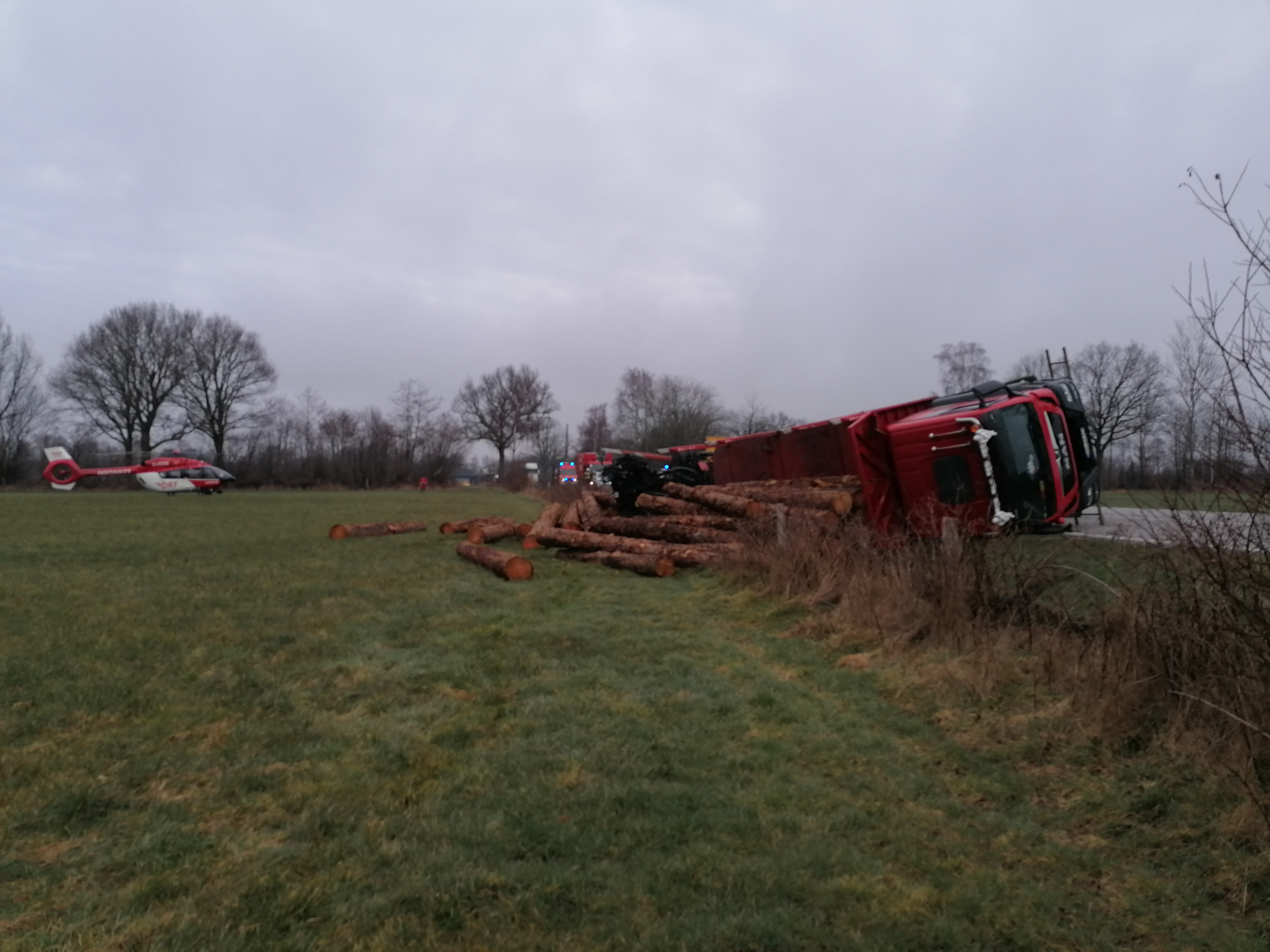 Am Vormittag wurden wir mit dem Stichwort "Technische Hilfeleistung, Mensch in Not" alarmiert. Ein mit Baumstämmen beladener LKW sollte umgestürzt und der Fahrer in seinem Führerhaus eingeschlossen sein.