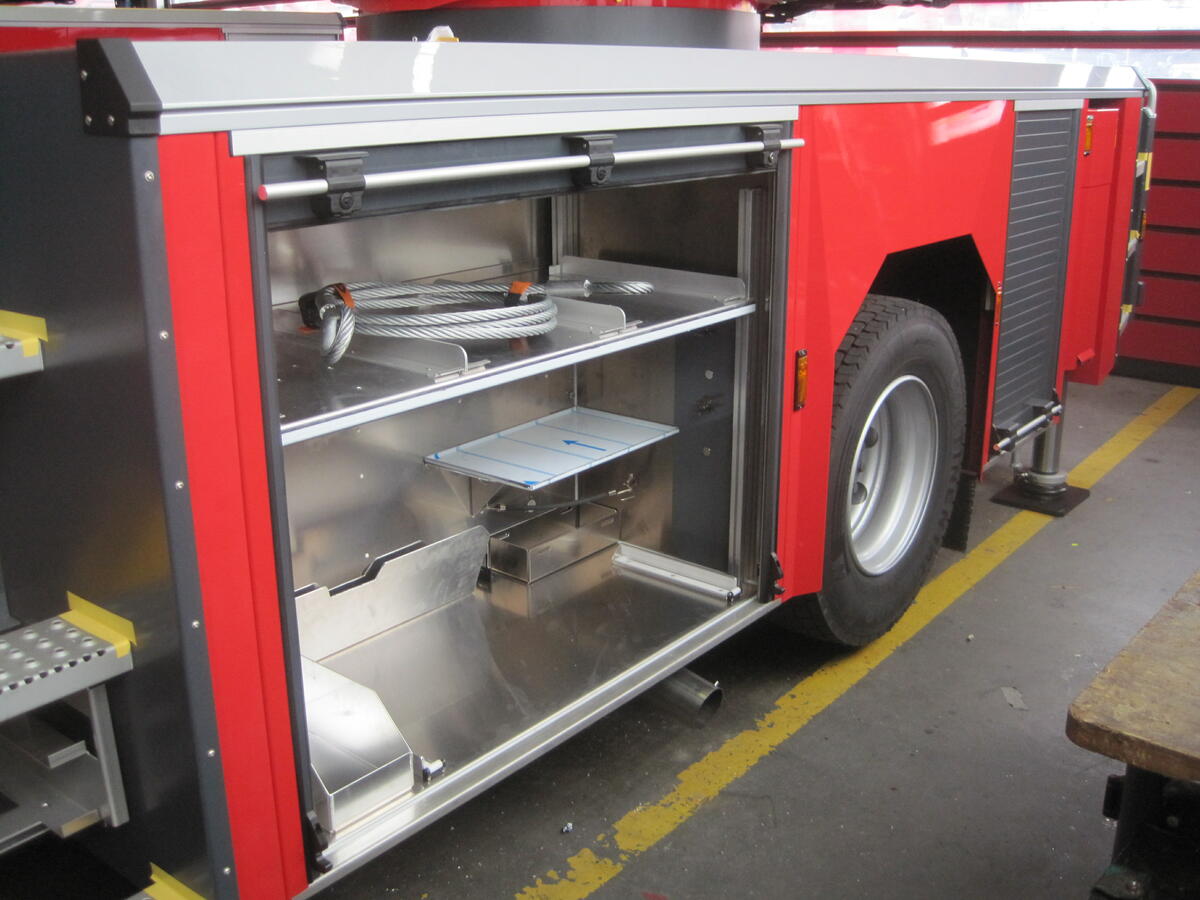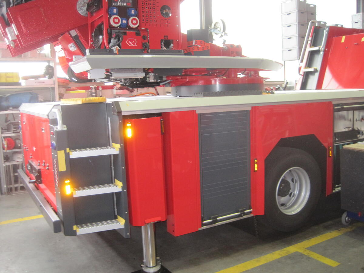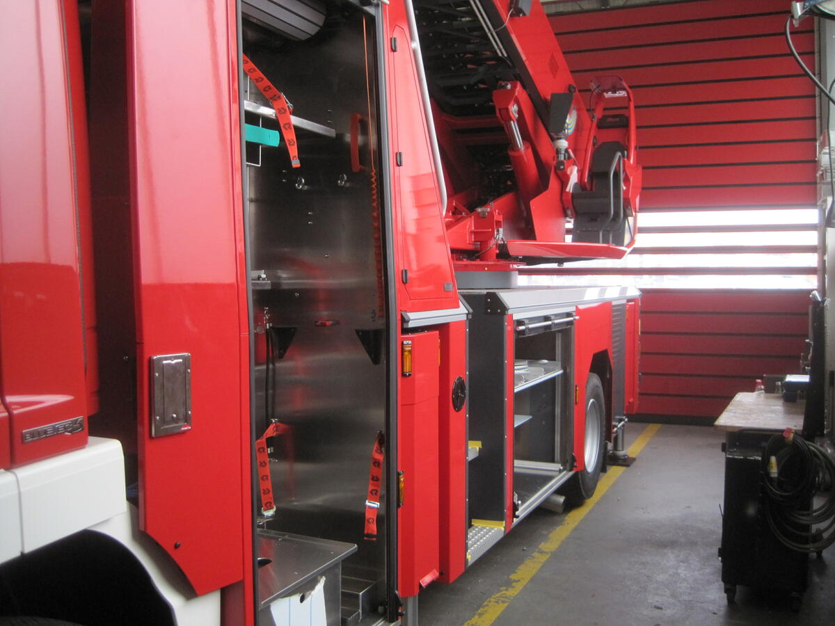 Erste Fotos von der Firma Metz zeigen, das der Bau der Drehleiter sich dem Ende zuneigt. Laut Projektleiter der Fa. Metz wird gerade am Innenausbau der Geräteräume gearbeitet.
