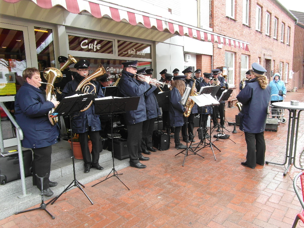 HOHENWESTEDT 1. April 2012. Der Feuerwehr Musikzug Hohenwestedt trotzte dem nasskalten Aprilwetter und spielte auch in diesem Jahr wieder auf dem Frühlingsmarkt in Hohenwestedt. (off)